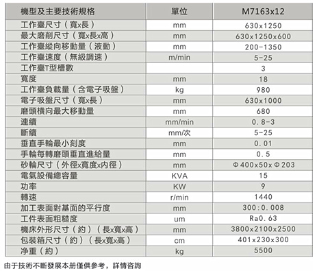 1、本機(jī)床屬于重切削磨床,適用于機(jī)械制造、模具等行業(yè)的平面磨削??赡ハ麂摷?、鑄件及有色金屬等材料。工件可直接固定在工作臺面上或放在電磁吸盤上磨削。